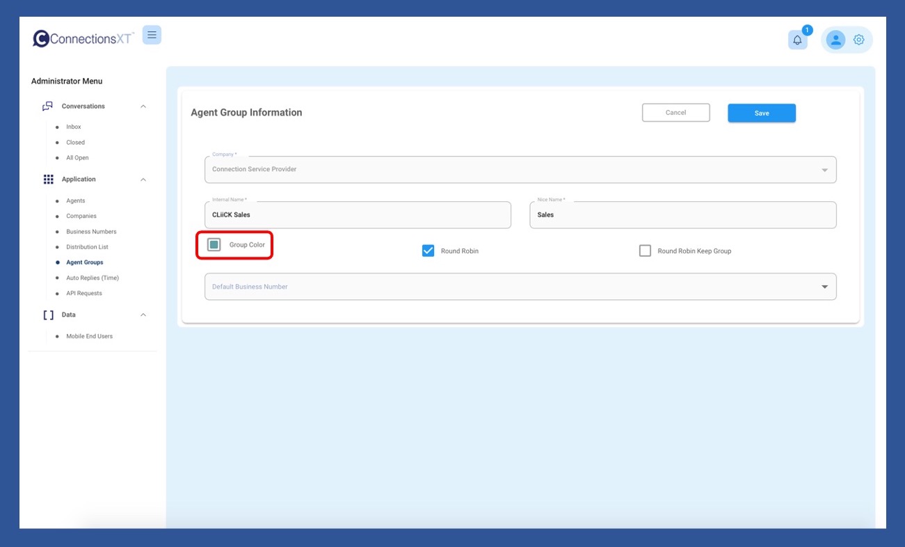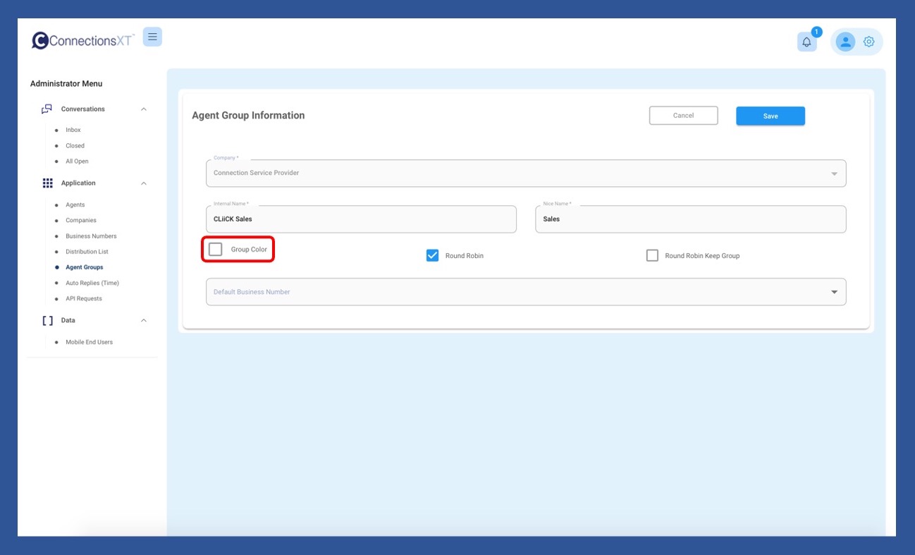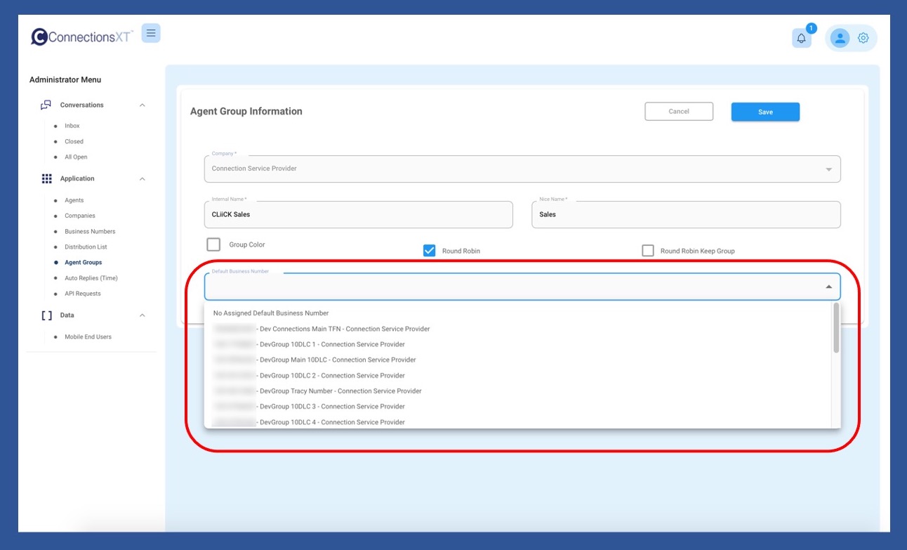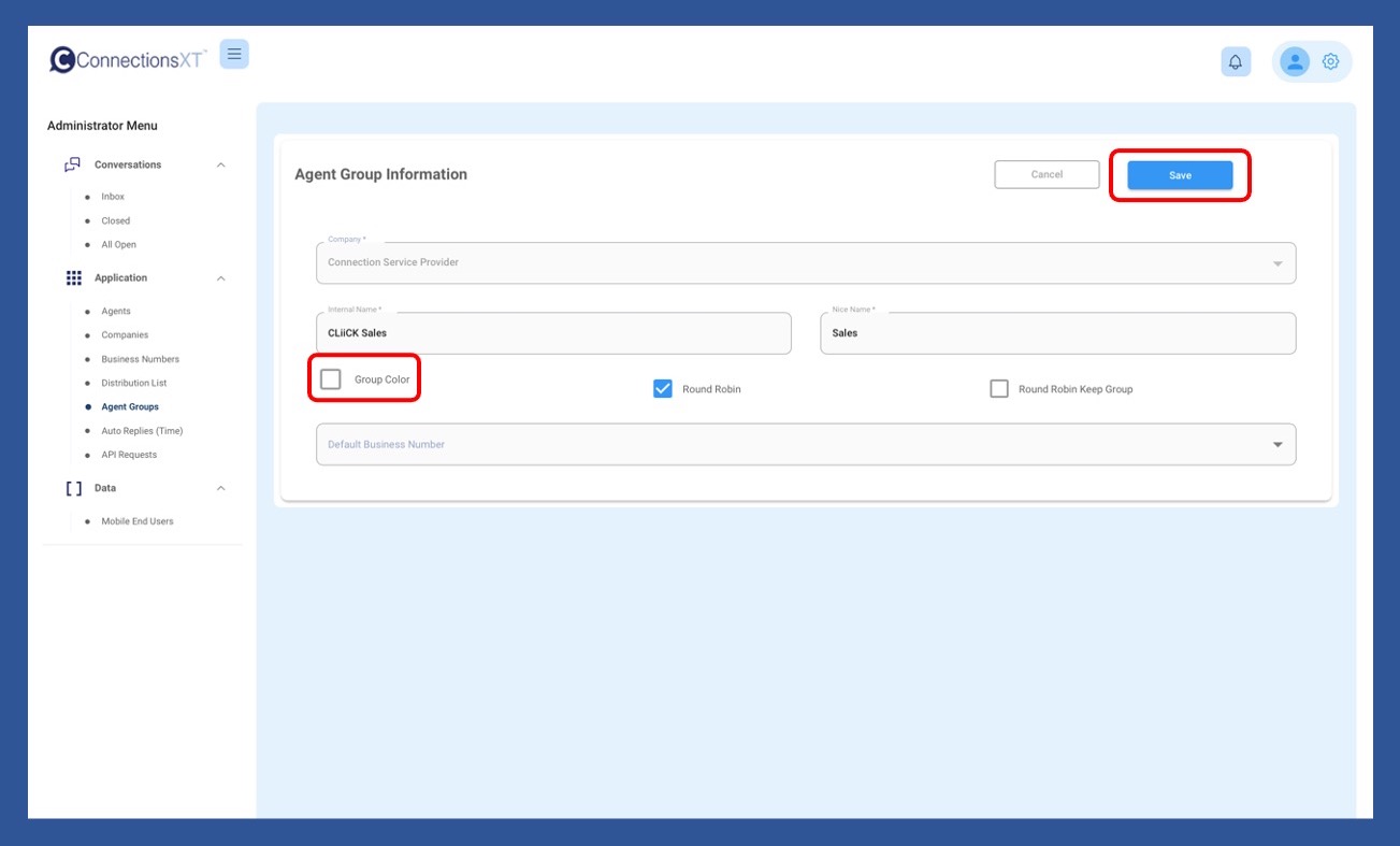 If you want to assign a default business number to the group, click into the Default Business Number field for available options.