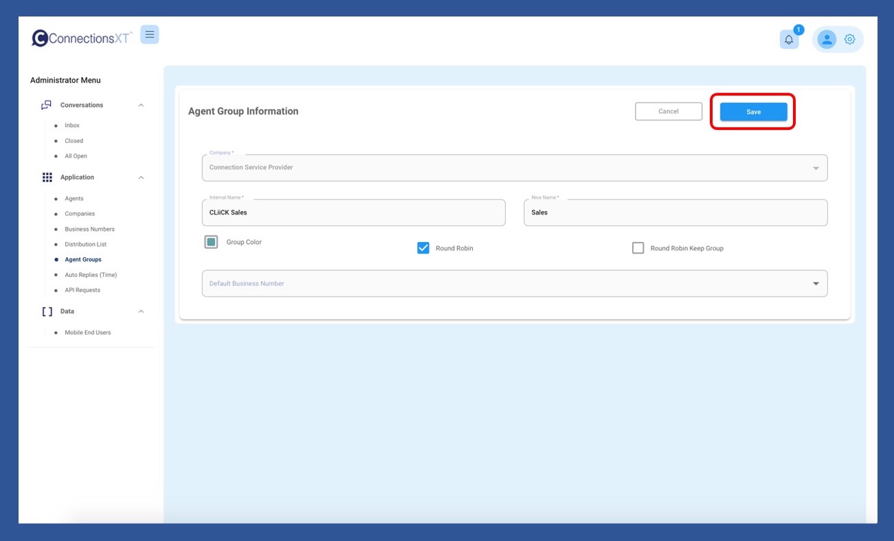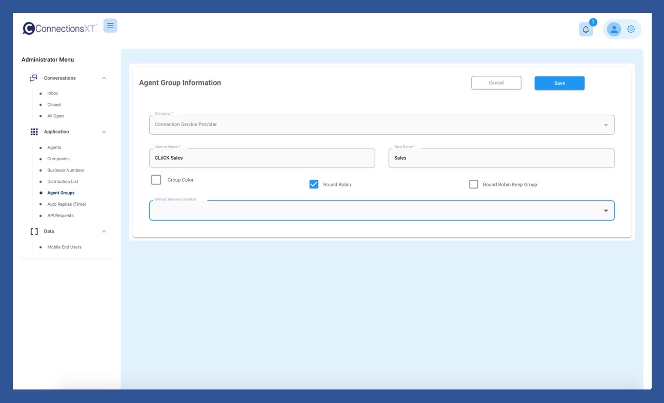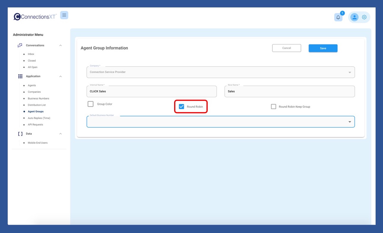 If you want to assign a default business number to the group, click into the Default Business Number field for available options.