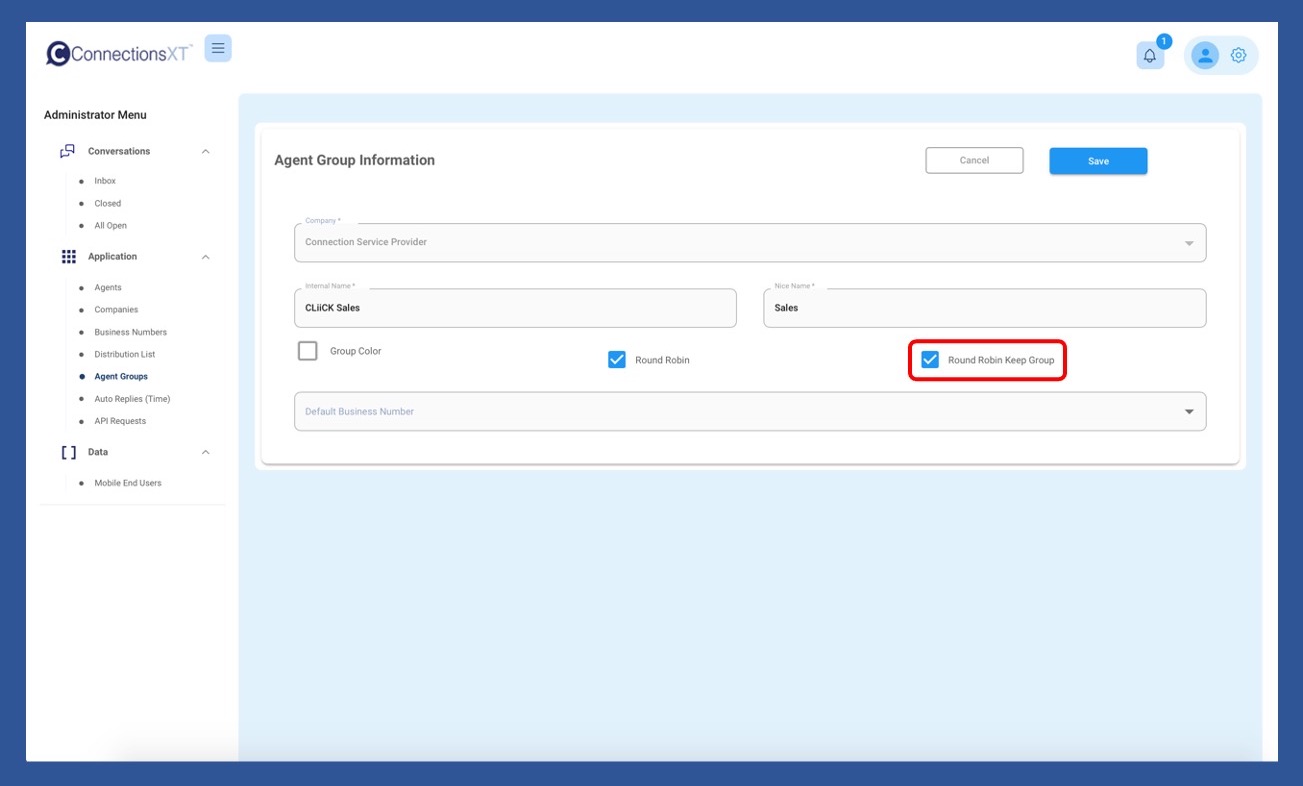 If you want to assign messages to the next available agent within a specific Agent Group, click the Round Robin Keep Group.