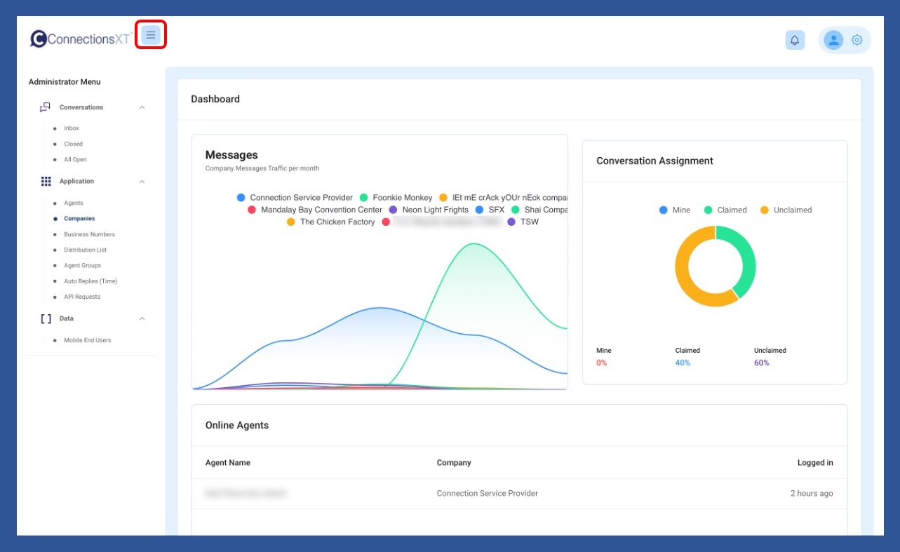 You can show the Administrator/Supervisor/Agent menu by clicking on the three-line hamburger menu to the right of the company logo.