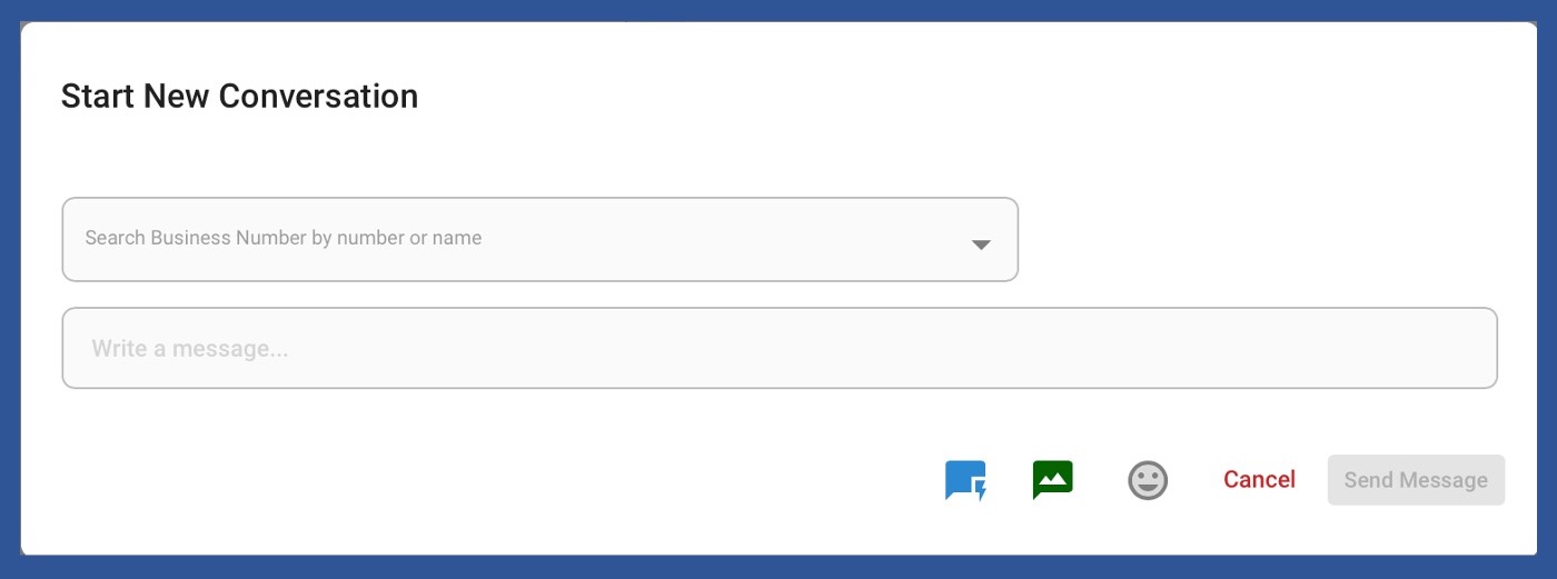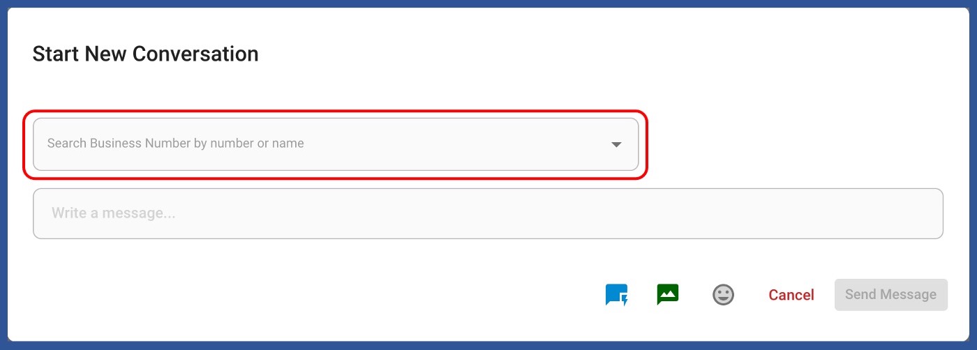 When the Start New Conversation popup box opens, click into the Search Business Number field, and choose the Business Number you'll be messaging from. You can search for the number by typing it into the box or scrolling through the list of available numbers.