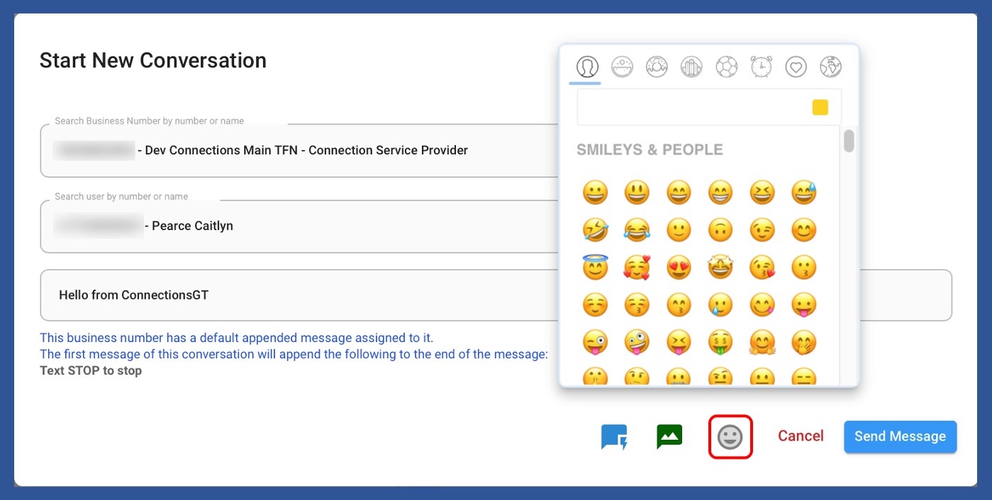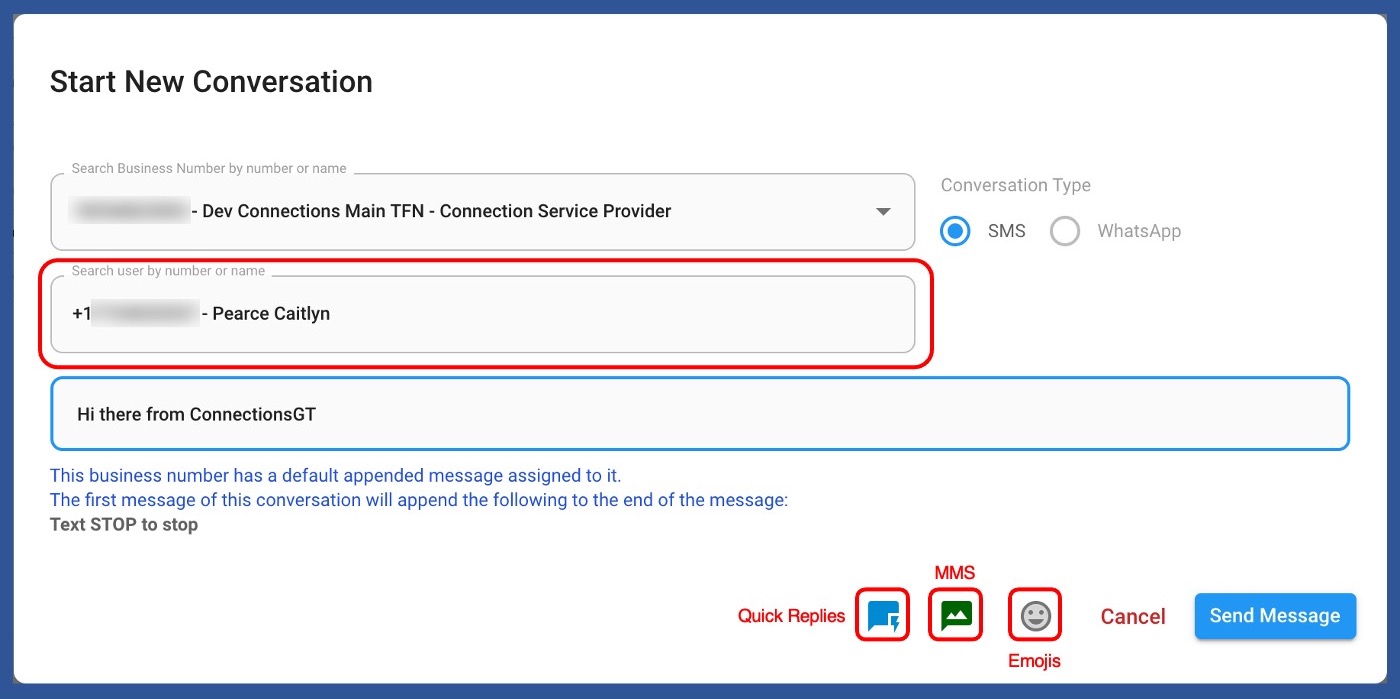 Enter your message and add any Quick Replies, MMS, or Emojis, and click Send Message when finished
