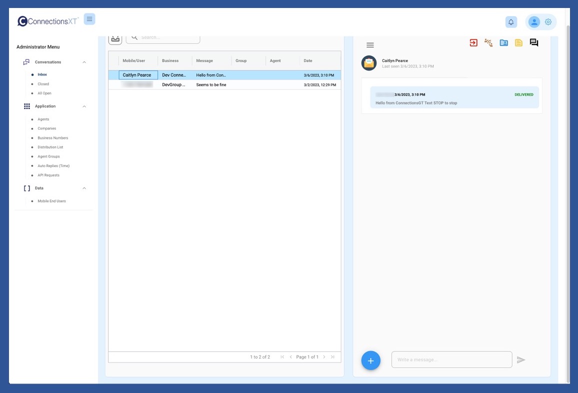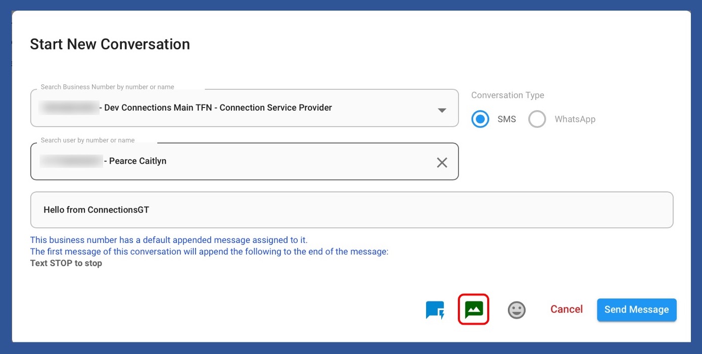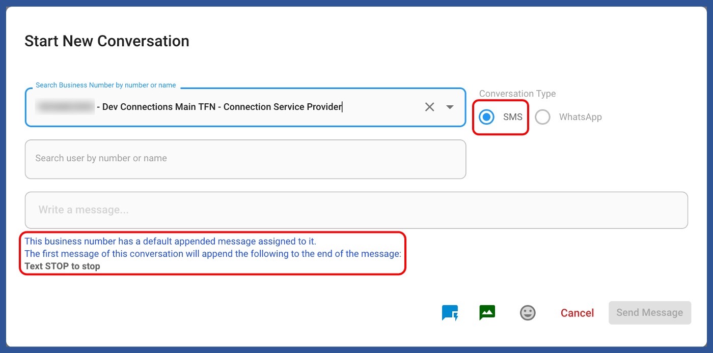 Once the business number is entered, SMS is automatically chosen as the Conversation Type. (WhatsApp is currently in process and not yet available.)
