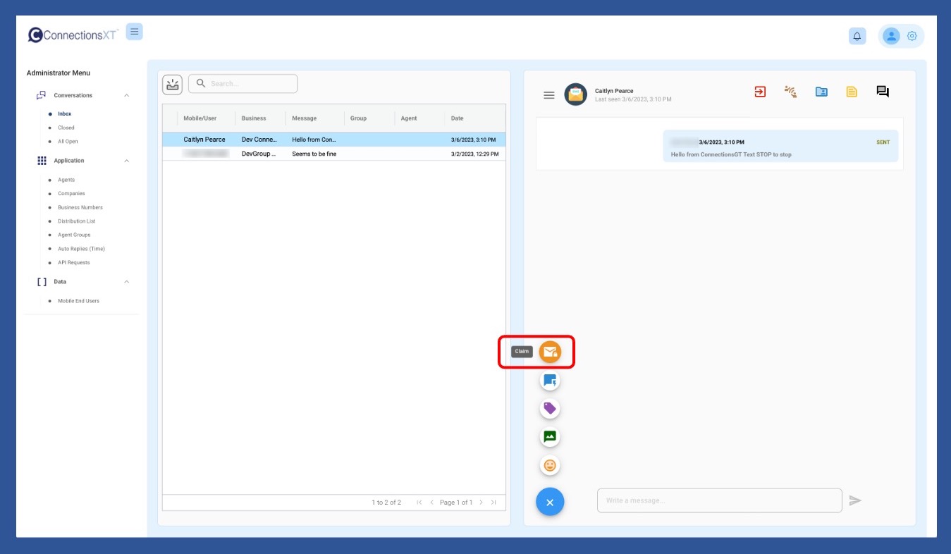 Then click the Claim icon. Once you do, the conversation will be assigned to you.