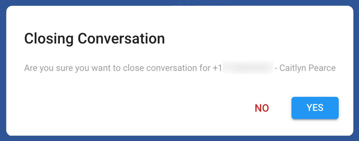 After you click on the Close Conversation icon, a popup will appear, confirming you’d like to close the conversation. Choose Yes to close the conversation and No if you decide you don’t want to close it.