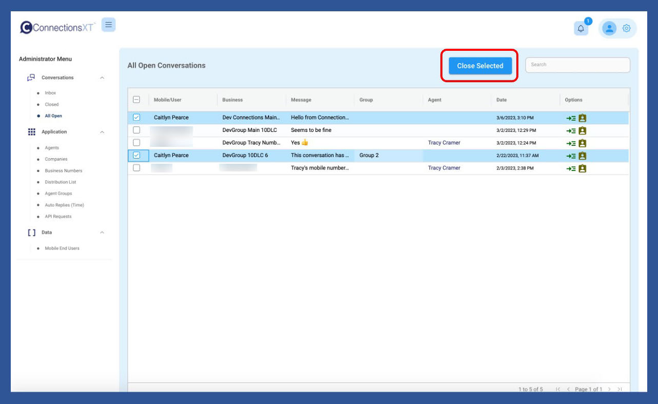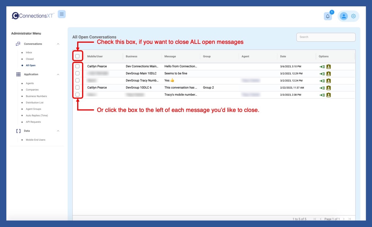 You can easily close multiple conversations. Start by selecting All Open from the Conversations section of the Administrator or Supervisor menu.