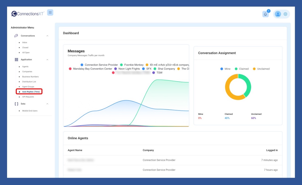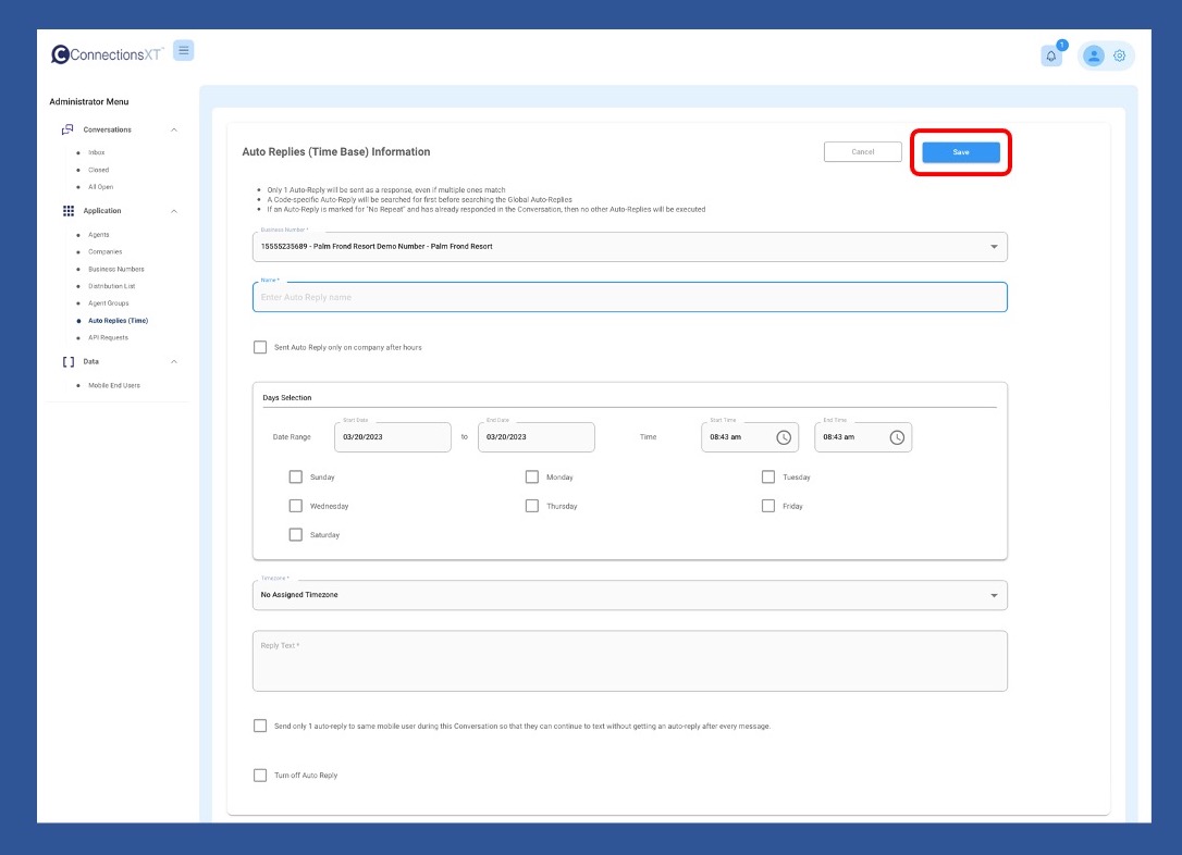 Only Company Admins or Supervisors can set up a time-based auto reply.