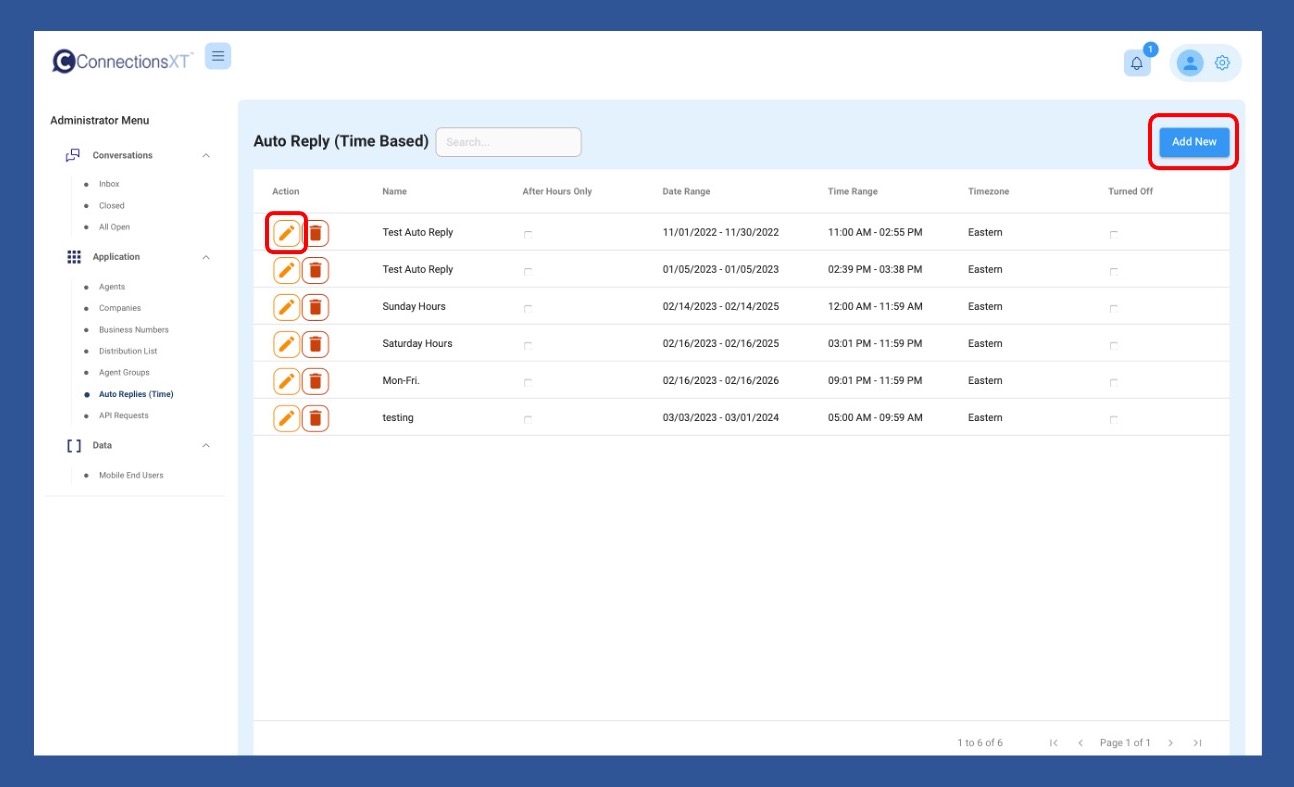 To set up a time-based auto reply, start by click on the Auto Reply (Time) link under the Application section of the Administrator or Supervisor Menu.