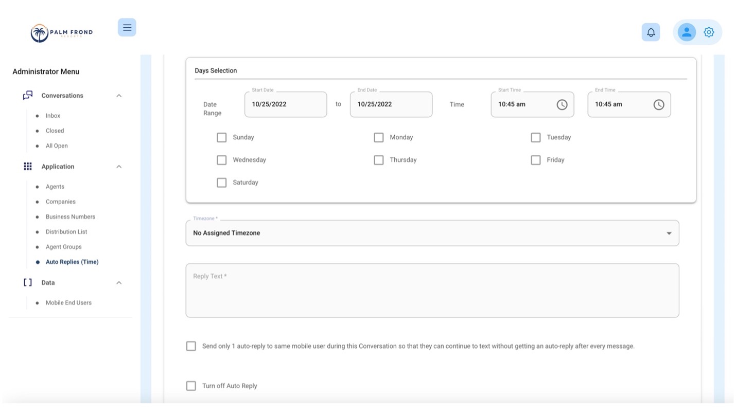 If you’d like to schedule the auto reply, enter the Date Range, the Start and End time, and choose the days of the week.
